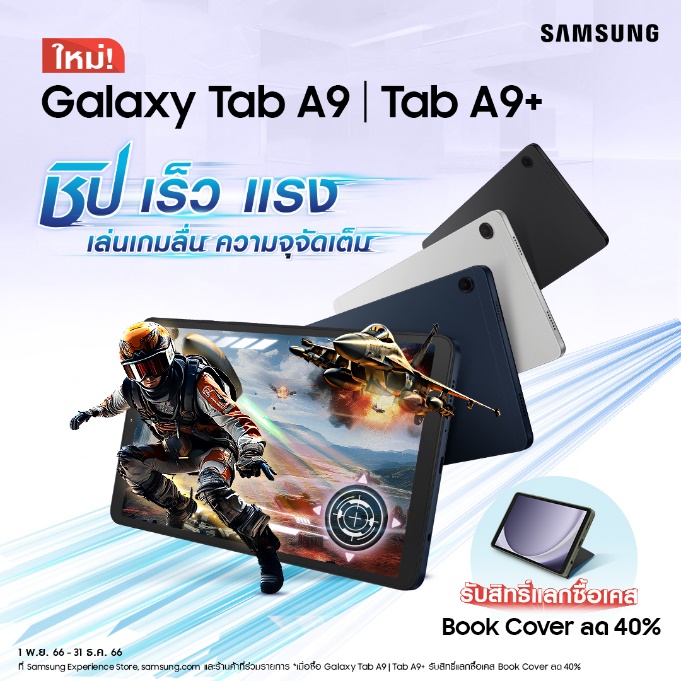 ซัมซุงประกาศเปิดตัว Galaxy Tab A9 series แท็บเล็ตใหม่ล่าสุดจากซัมซุงที่ถูกสร้างสรรค์ขึ้นเพื่อมอบประสบการณ์การใช้งานอันแสนยอดเยี่ยมให้กับทุกคนในราคาที่แสนคุ้มค่า โดยแท็บเล็ตในซีรีส์นี้ได้ผสมผสานความสามารถในการเล่นวิดีโอและการเล่นเสียงที่ดื่มด่ำเข้ากับการเชื่อมต่อที่รวดเร็วเป็นพิเศษเพื่อรองรับความต้องการในด้านความบันเทิงพร้อมยกระดับประสิทธิภาพการทำงานของผู้ใช้งานในทุกๆ วันในรูปแบบที่พกพาได้ ซึ่งมีให้เลือกทั้งหมด 2 รุ่นด้วยกัน โดย Galaxy Tab A9 และGalaxy Tab A9+ เป็นตัวอย่างที่ดีในการอธิบายถึงการเชื่อมต่อในกาแล็คซี่อีโคซิสเต็มที่มอบประสบการณ์ในด้านต่างๆ ได้อย่างต่อเนื่องไม่มีสะดุดผ่านกาแล็คซี่ดีไวซ์ที่หลากหลาย อีกทั้งยังเป็นแนวทางในด้านนวัตกรรมใหม่ๆ ให้กับผู้ใช้รวมไปถึงคนที่พวกเขารักให้สามารถใช้งานและสำรวจอาณาจักรดิจิทัลได้อย่างปลอดภัย