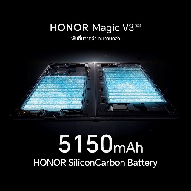 HONOR Magic V3 ฉีกกฎสมาร์ตโฟนจอพับ ด้วยความบางและเบา บางเพียง 9.2 มิลลิเมตร ขณะพับจอ และ 4.35 มิลลิเมตร เมื่อกางหน้าจอออก น้ำหนักเบาเพียง 226 กรัม ซึ่งทำลายสถิติสมาร์ตโฟนพับได้รุ่นก่อนหน้าอย่าง HONOR Magic V2 ด้านแบตเตอรี่ HONOR Magic V3 มาพร้อมนวัตกรรมแบตเตอรี่ซิลิคอนคาร์บอนที่บางเพียง 2.61 มิลลิเมตร แต่ให้ความจุสูงถึง 5150mAh ถือเป็นความจุที่เยอะที่สุดในสมาร์ตโฟนจอพับในปัจจุบัน นอกจากนี้ ยังรองรับการชาร์จด้วยสายแบบ HONOR SuperCharge 66W และการชาร์จแบบไร้สาย 50W ทำให้สามารถพกพาสมาร์ตโฟนไปได้ทุกที่ทุกเวลา พร้อมใช้งานได้อย่างต่อเนื่องสองจอโดยไม่ต้องกังวลเรื่องแบตเตอรี่หมด