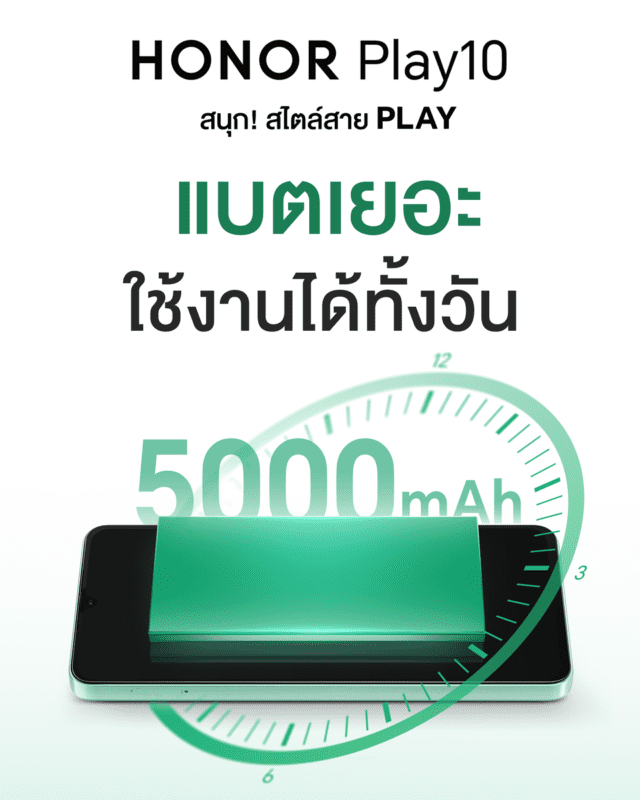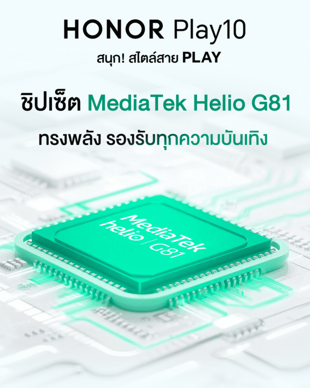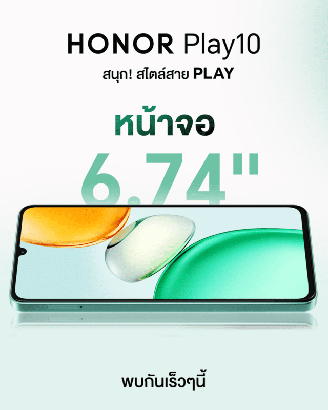 นอกจากนี้ HONOR ยังเตรียมเปิดตัวสมาร์ตโฟนอีกรุ่นที่น่าจับตามองอย่าง HONOR Play 10 มาพร้อมคอนเซ็ปต์ ‘สนุก สไตล์สายเพล์’ ซึ่งออกแบบมาเพื่อตอบโจทย์ผู้ใช้งานที่มองหาความคุ้มค่าและประสิทธิภาพการใช้งานในชีวิตประจำวัน โดดเด่นด้วยแบตเตอรี่ขนาดใหญ่ 5,000mAh ชาร์จไว 10W พร้อมหน้าจอขนาดใหญ่ 6.74 นิ้ว ให้ภาพคมชัดและลื่นไหลด้วย อัตรารีเฟรช 90Hz เพิ่มอรรถรสทั้งการรับชมคอนเทนต์และการใช้งานทั่วไป ด้านประสิทธิภาพ HONOR Play 10 มาพร้อมชิปเซ็ต MediaTek Helio G81 แบบ Octa-core ช่วยให้การประมวลผลเป็นไปอย่างรวดเร็วและเสถียร รองรับการใช้งานหลากหลายรูปแบบ ทั้งการสื่อสาร ความบันเทิง และการใช้งานในชีวิตประจำวันได้อย่างลงตัว