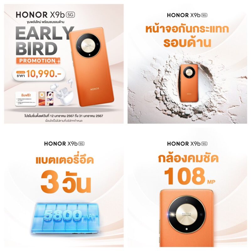 บรรทัดฐานใหม่ของตลาดสมาร์ตโฟนและความน่าเชื่อถือในระดับโลก และปัจจุบันแบรนด์ HONOR ขยายธุรกิจไปกว่า 100 ประเทศ และมีฐานลูกค้ากว่า 180 ล้านคนทั่วโลก โดยในปีนี้เราได้นำอีกหนึ่งรุ่นอย่าง HONOR X9b ที่ถือเป็นอีกหนึ่งสมาร์ตโฟนระดับกลางที่เต็มไปด้วยคุณภาพและคุณสมบัติสุดล้ำ ด้วยการใช้วัสดุเกรดพรีเมียม แข็งแรง ทนทาน โดดเด่นด้วยหน้าจอและตัวเครื่องกันกระแทกรอบด้าน 360 องศา เสริมประสิทธิภาพการใช้งานที่ยาวนานด้วยแบตเตอรี่ขนาด 5800mAh มาพร้อมระบบกล้องสามตัวที่ทำให้ภาพมีความละเอียด คมชัด สีสันสดใส สวยงามสมจริง ในราคาสุดคุ้มเพียง 10,990 บาท* เข้ามาจัดจำหน่ายในประเทศไทย เพื่อให้ทุกคนได้สัมผัสกับที่สุดของประสบการณ์การใช้สมาร์ตโฟนที่เหนือระดับ อีกทั้งยังมอบความพิเศษด้วยการเลือกนักมวยซุปตาร์ที่กำลังได้รับความนิยมอย่าง“ตะวันฉาย” เป็นพรีเซนเตอร์ โดยถือเป็นตัวแทนของความแข็งแกร่ง ทนทาน เหมาะกับแบรนด์และคอนเซปต์ของ HONOR X9b”