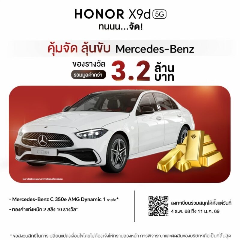 HONOR X9d 5G วางจำหน่ายในประเทศไทยกับความจุเดียว 12GB + 256GB พร้อม 3 เฉดสีพรีเมียม ได้แก่ Reddish Brown (สีน้ำตาลแดง), Sunrise Gold (สีทองประกาย) และ Midnight Black (สีดำยามค่ำคืน) ในราคาคุ้มค่า 11,990 บาท มาพร้อมโปรสุดคุ้ม 3 ต่อ โดยต่อที่ 1 รับฟรี! HONOR Choice Watch 2i มูลค่ารวม 2,999 บาท ต่อที่ 2 อุ่นใจด้วยประกันจัดเต็มด้วยประกันศูนย์นาน 2 ปี รับประกันหน้าจอแตก 2ปี เปลี่ยนเครื่องได้ 2 ครั้ง และประกันแบตเตอรี่ระยะเวลา 2 ปี เปลี่ยนแบตเตอรี่ได้ 1 ครั้ง เมื่อประสิทธิภาพแบตเตอรี่ต่ำกว่า 80% และต่อที่ 3 พิเศษสุด! รับสิทธิ์เป็นผู้โชคดีรับรางวัลใหญ่รถ Mercedes-Benz C 350e AMG Dynamic จำนวน 1 รางวัล หรือ ทองคำหนัก 2 สลึง จำนวน 10 รางวัล โปรโมชั่นและสิทธิ์ลุ้นรางวัลใหญ่ เปิดให้ร่วมตั้งแต่วันที่ 4 ธันวาคม 2568 ถึง