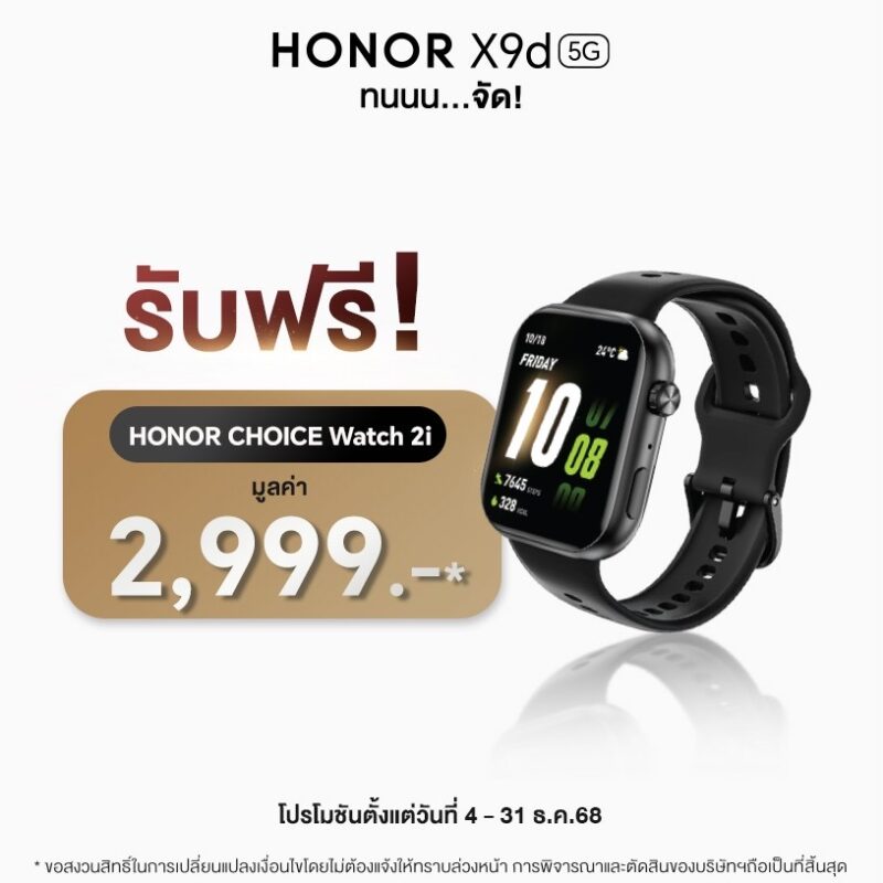 ออเนอร์ (HONOR) ผู้ให้บริการอุปกรณ์อัจฉริยะชั้นนำระดับโลก เดินหน้ารุกตลาดสมาร์ตโฟนไทย ส่งท้ายปีด้วยการเปิดตัวHONOR X9d 5G อย่างเป็นทางการ ภายใต้สโลแกน“ทนนน…จัด!” โดยสมาร์ตโฟนรุ่นนี้สร้างมาตรฐานใหม่ให้เป็นสมาร์ตโฟนระดับกลางที่ทรงพลังที่สุดในตลาด โดดเด่นด้วยโครงสร้างสุดแข็งแกร่ง รองรับการตกกระแทกสูงสุด 2.5 เมตร พร้อมผ่านมาตรฐานกันน้ำกันฝุ่นระดับสูงสุดครอบคลุมทั้ง IP69K, IP69, IP68 และ IP66 ผสานสมรรถนะด้านการใช้งานเหนือชั้นด้วยแบตเตอรี่ขนาด 8,300mAh ซึ่งเป็นความจุที่ใหญ่ที่สุดในตลาดสมาร์ตโฟนปัจจุบัน ขณะที่ด้านการถ่ายภาพมาพร้อมกล้อง AI Camera อัจฉริยะ ความละเอียด108MP เสริมด้วยระบบกันสั่นคู่ OIS + EIS ช่วยให้ผู้ใช้เก็บภาพได้คมชัดทุกสภาพแสง ด้วยการออกแบบที่ตอบโจทย์ทุกความต้องการของผู้ใช้รุ่นใหม่ ทั้งความทนทาน ประสิทธิภาพ และประสบการณ์การถ่ายภาพที่ครบเครื่อง HONOR X9d 5G จึงนับเป็นหนึ่งในสมาร์ตโฟนระดับกลางที่คุ้มค่าที่สุดในตลาด เปิดตัวในราคา11,990 บาท นอกจากนี้ ยังสร้างสีสันด้วยการดึงศิลปินลูกทุ่งชื่อดัง ‘ก้อง ห้วยไร่’ กลับมาเป็นพรีเซนเตอร์ และHONOR’s Friend เป็นปีที่สอง เพื่อสะท้อนภาพลักษณ์ความแกร่ง คุ้มค่า และเข้าถึงผู้ใช้ทุกกลุ่มได้อย่างลงตัว