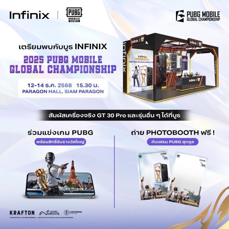 ร่วมรับชมการแข่งขันสุดเร้าใจของ PUBG MOBILE Global Championship 2025 และพบกับบูธอินฟินิกซ์ที่เปิดให้ผู้ร่วมงานได้มาสัมผัสและทดลองเล่นเกมแบบมือโปรกับ Infinix GT 30 พร้อมกิจกรรมภายในบูธ อาทิ การแข่งขัน PUBG เพื่อลุ้นรับรางวัลใหญ่ ร่วมถ่ายสุดประทับใจกับ Photo Booth พร้อมเฟรม PUBG สุดพิเศษ เตรียมตัวให้พร้อมแล้วพบกันได้ในวันที่ 12 -14 ธันวาคม 2568 ณ สยามพารากอนฮอลล์