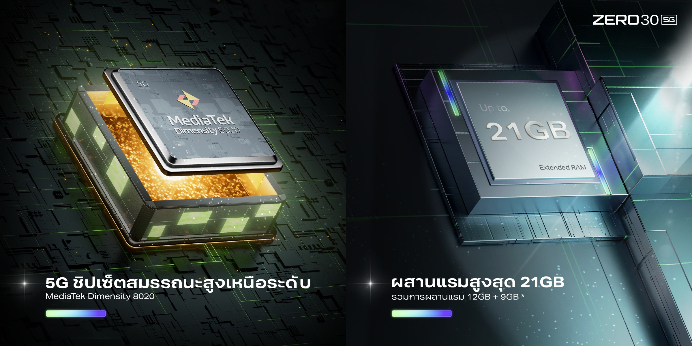สำหรับ Infinix ZERO 30 5G มาพร้อมกับชิปเซ็ตประมวลผลระดับเรือธง Dimensity 8020 5G ขนาด 6 นาโนเมตร ผสานประสิทธิภาพกับตัวประมวลผลแบบ octa-core ขั้นสูง ขนาด 6nm จาก TSMC CPU สูงสุดถึง 2.6Hz ที่ช่วยยกระดับความเร็วในการใช้งานแอปฯ รองรับไฟล์เกมขนาดใหญ่ ๆ และทำให้การเชื่อมต่อราบรื่น หมดปัญหาเรื่องเครื่องช้าหรือกระตุก และยังมี Cortex-A78 สูงสุด 2.6GHz ที่ทำให้การใช้งานลื่นไหลมากยิ่งขึ้น โดยรุ่นนี้จุใจไปกับการผสานแรมสูงสุดถึง 21GB (12+9GB โดยใช้เทคโนโลยีฟิวชั่นเมมโมรี่) ที่มาพร้อม ROM สูงถึง 256 GB จึงทำให้สามารถรองรับการถ่ายวิดีโอคุณภาพสูง 4K ที่ไม่ว่าจะถ่ายนานแค่ไหน ก็ไม่ต้องกังวล
