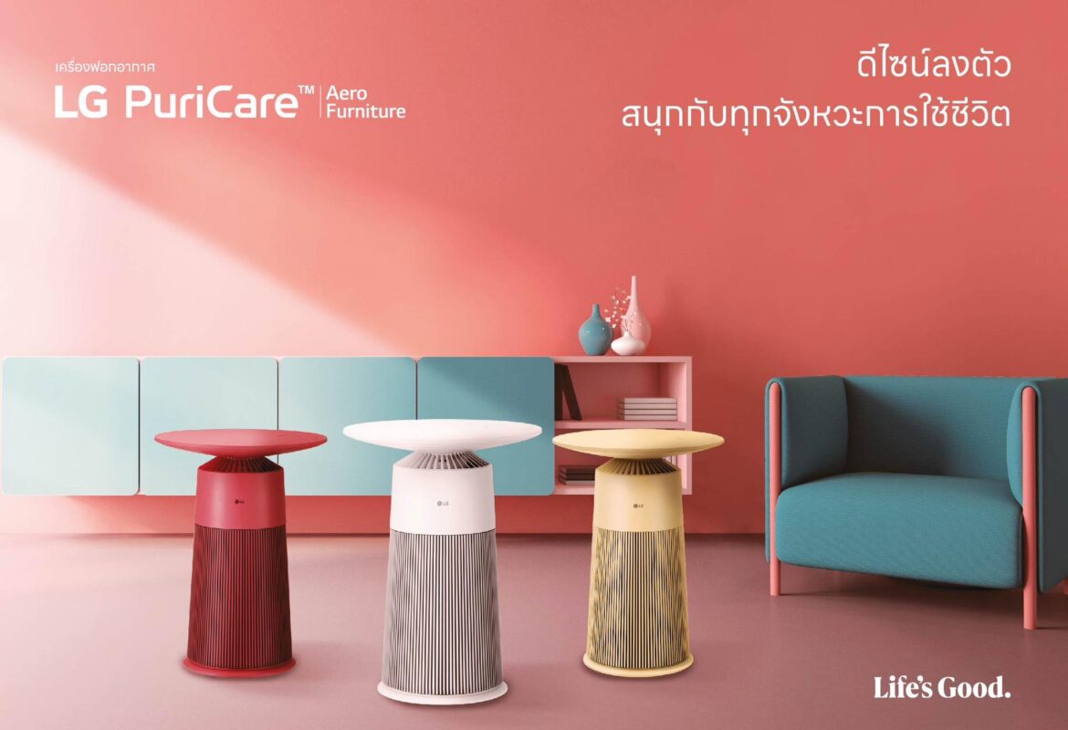 ส่วน LG PuriCare AeroFurniture คือคำจำกัดความอันสมบูรณ์แบบสำหรับการเป็นมากกว่าเครื่องใช้ไฟฟ้า เพราะมาในรูปทรงของโต๊ะที่จะช่วยเพิ่มประโยชน์ใช้สอยพร้อมกับดีไซน์ที่สวยงาม การันตีด้วยรางวัล Red Dot Design 2023 สาขาผลิตภัณฑ์นวัตกรรมด้านการออกแบบ โดยมีให้ลูกค้าเลือกถึง 3 สีเพื่อรองรับทุกสไตล์การแต่งห้อง ได้แก่ สีขาว สีเหลือง และสีแดง เพิ่มสีสัน ทั้งยังพร้อมสร้างบรรยากาศให้กับทุกการใช้งานได้ด้วยโคมไฟ Mood Lighting ที่สามารถเปลี่ยนแสงไฟด้วยการควบคุมอย่างง่ายดายเพียงกดปุ่ม หรือสั่งงานผ่านแอปพลิเคชัน LG ThinQ และมีระบบฟอกอากาศที่เปี่ยมประสิทธิภาพจากตัวกรอง HEPA 360 ที่กำจัดแบคทีเรียในอากาศได้ถึง 99 เปอร์เซ็นต์ ทำงานด้วยเสียงเบาเพียง 21 เดซิเบล ตอบโจทย์ไลฟ์สไตล์ยุคใหม่ด้วยฟีเจอร์แท่นชาร์จสมาร์ทโฟนแบบไร้สาย นี่จึงเป็นเครื่องฟอกอากาศที่ช่วยสร้างอากาศบริสุทธิ์ และเติมเต็มดีไซน์และการใช้งานให้กับห้องของคุณได้แบบไม่เหมือนใคร