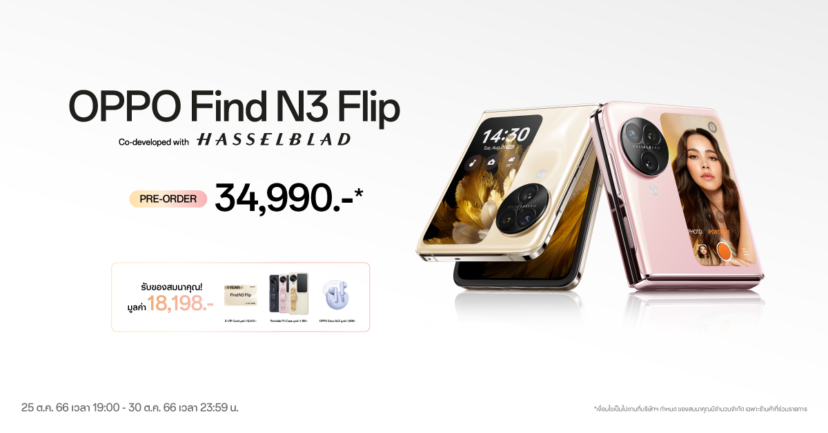 สำหรับใครที่อยากเป็นเจ้าของ OPPO Find N3 Flip | Aristotle เพียงแค่พรีออเดอร์ OPPO Find N3 Flip ราคา 34,990 บาท รับฟรีคอลเลกชันสุดเอกซ์คลูซิฟ OPPO Find N3 Flip | Aristotle มูลค่า 2,499 บาท ตั้งแต่วันนี้เป็นต้นไปหรือจนกว่าสินค้าจะหมด ที่ตัวแทนจำหน่ายที่ร่วมรายการ