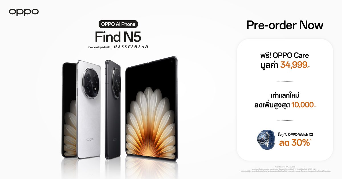 ออปโป้ ไทยแลนด์ ผู้นำตลาดสมาร์ตโฟน เปิดตัว “OPPO Find N5” รุ่นใหม่ล่าสุด ฉีกทุกกฎของสมาร์ตโฟนจอพับระดับแฟลกชิปด้วยดีไซน์ที่บางที่สุด พร้อมฟีเจอร์ที่ตอบโจทย์การทำงานของกลุ่มผู้บริหารโดยเฉพาะ รองรับการทำงานแบบมัลติทาสก์และพกพาสะดวก ตั้งเป้ารุกตลาดพรีเมียมด้วยผลิตภัณฑ์ระดับแนวหน้าที่ออกแบบมาเพื่อตอบสนองไลฟ์สไตล์ของกลุ่มผู้นำที่มองหาสมาร์ตโฟนทรงพลัง เปิดตัวแล้วในราคา 69,999 บาท ณ OPPO Brand Shop ทุกสาขา และตัวแทนจำหน่ายทั่วประเทศ