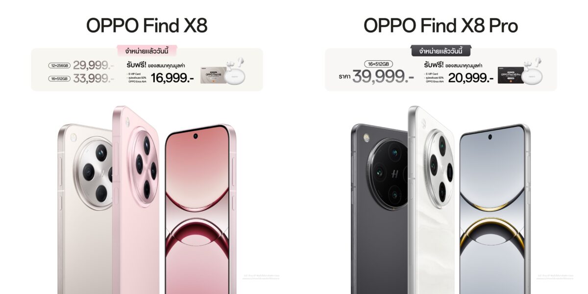 ออปโป้ ไทยแลนด์ ส่งสมาร์ตโฟนที่สุดแห่งปี “OPPO Find X8 Series” รุ่นล่าสุด มาพร้อมมาตรฐานแฟลกชิปที่เหนือกว่า ให้สัมผัสประสบการณ์ซูมที่ดีที่สุดด้วย AI Telescope Zoom ซูมด้วยพลัง AI ไกล 120 เท่า มาพร้อมไฮไลต์อย่าง Hasselblad Portrait Mode ที่ถ่ายภาพบุคคลได้สมจริงเหนือชั้น สมาร์ตรอบด้านจาก AI Photo Remaster และ AI Productivity ให้ช่วยปรับแต่งภาพและทำงานได้อย่างชาญฉลาดบนระบบปฏิบัติการ ColorOS 15 มอบประสบการณ์ใช้งานที่ราบรื่น ตอบโจทย์ผู้ใช้ยุคใหม่ได้อย่างลงตัว ในดีไซน์บางเบาเรียบหรูเหนือกาลเวลา เปิดตัวพร้อมกัน 2 รุ่น ได้แก่ OPPO Find X8 ราคาเริ่มต้น 29,999 บาท และ OPPO Find X8 Pro ราคา 39,999 บาท สัมผัสพร้อมกันได้แล้ววันนี้ ณ OPPO Brand Shop ทุกสาขา และตัวแทนจำหน่ายทั่วประเทศ