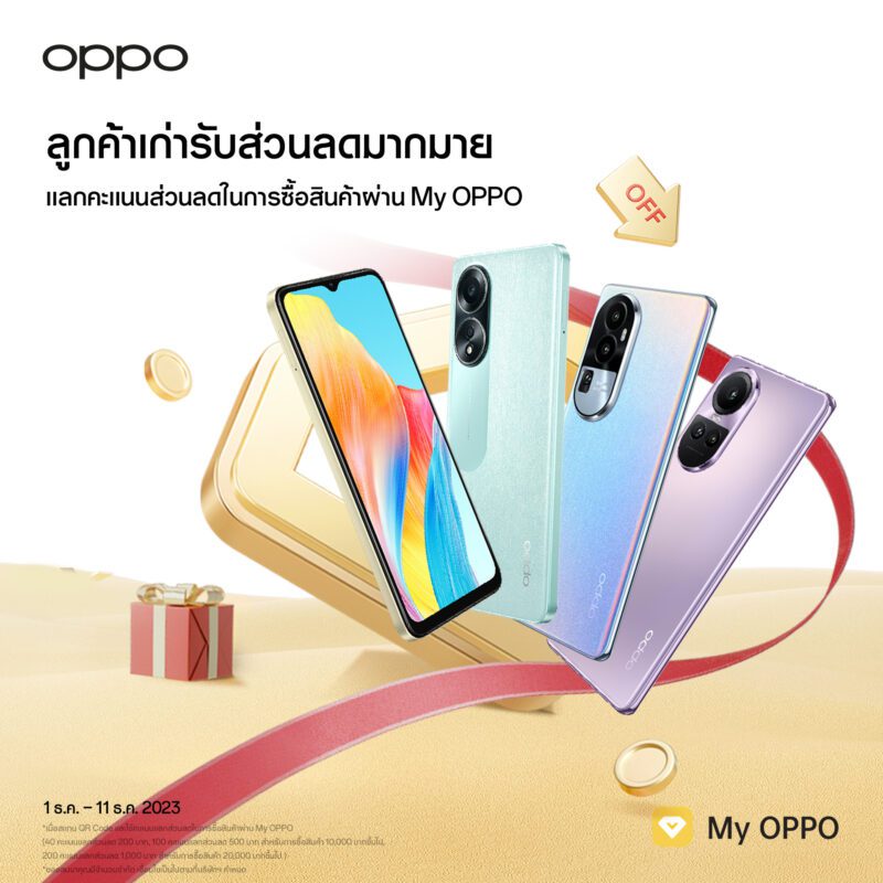 ของขวัญสุดพิเศษสำหรับลูกค้าเก่า ให้คุณรับส่วนลดมากมาย เมื่อแสกน QR Code และใช้คะแนนแลกส่วนลดในการซื้อสินค้าผ่าน My OPPO (40 คะแนนแลกส่วนลด 200 บาท, 100 คะแนนแลกส่วนลด 500 บาท สำหรับการซื้อสินค้า 10,000 บาทขึ้นไป, 200 คะแนนแลกส่วนลด 1,000 บาท สำหรับการซื้อสินค้า 20,000 บาทขึ้นไป )