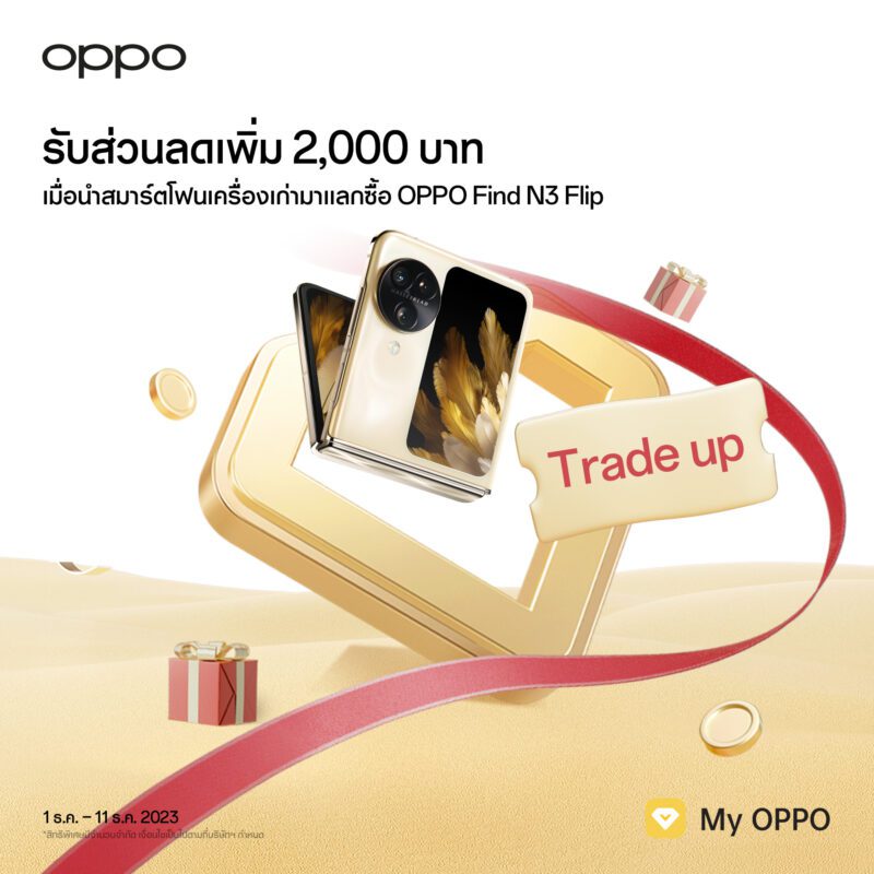 สำหรับใครที่กำลังมองหาสมาร์ตโฟนเครื่องใหม่ OPPO จัดโปรสุดพิเศษเก่าแลกใหม่ รับส่วนลดเพิ่ม 2,000 บาท เมื่อนำสมาร์ตโฟนเครื่องเก่ามาแลกซื้อ OPPO Find N3 Flip สมาร์ตโฟนจอพับกับกล้องที่ดีกว่า ให้คุณถ่ายภาพพอร์ตเทรตสวยทรงพลังที่สุด