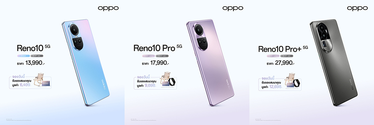 สัมผัสกับ OPPO Reno10 Series 5G สมาร์ตโฟน 5G กับพลังแห่ง “The Portrait Expert” ทั้ง 3 รุ่น ได้แก่ OPPO Reno10 5G, OPPO Reno10 Pro 5G และ OPPO Reno 10 Pro+ 5G รวมถึงหูฟังไร้สาย OPPO Enco Air3 Pro ได้แล้ววันนี้ ณ OPPO Brand Shop ทุกสาขา และตัวแทนจำหน่ายทั่วประเทศ พิเศษสุด! สำหรับผู้ที่สั่งซื้อ OPPO Reno10 Series 5G ล่วงหน้าระหว่างวันนี้ – 26 กรกฎาคม 2566 รับฟรีทันทีของสมนาคุณรวมมูลค่าสูงสุด 12,698 บาท ประกอบไปด้วย