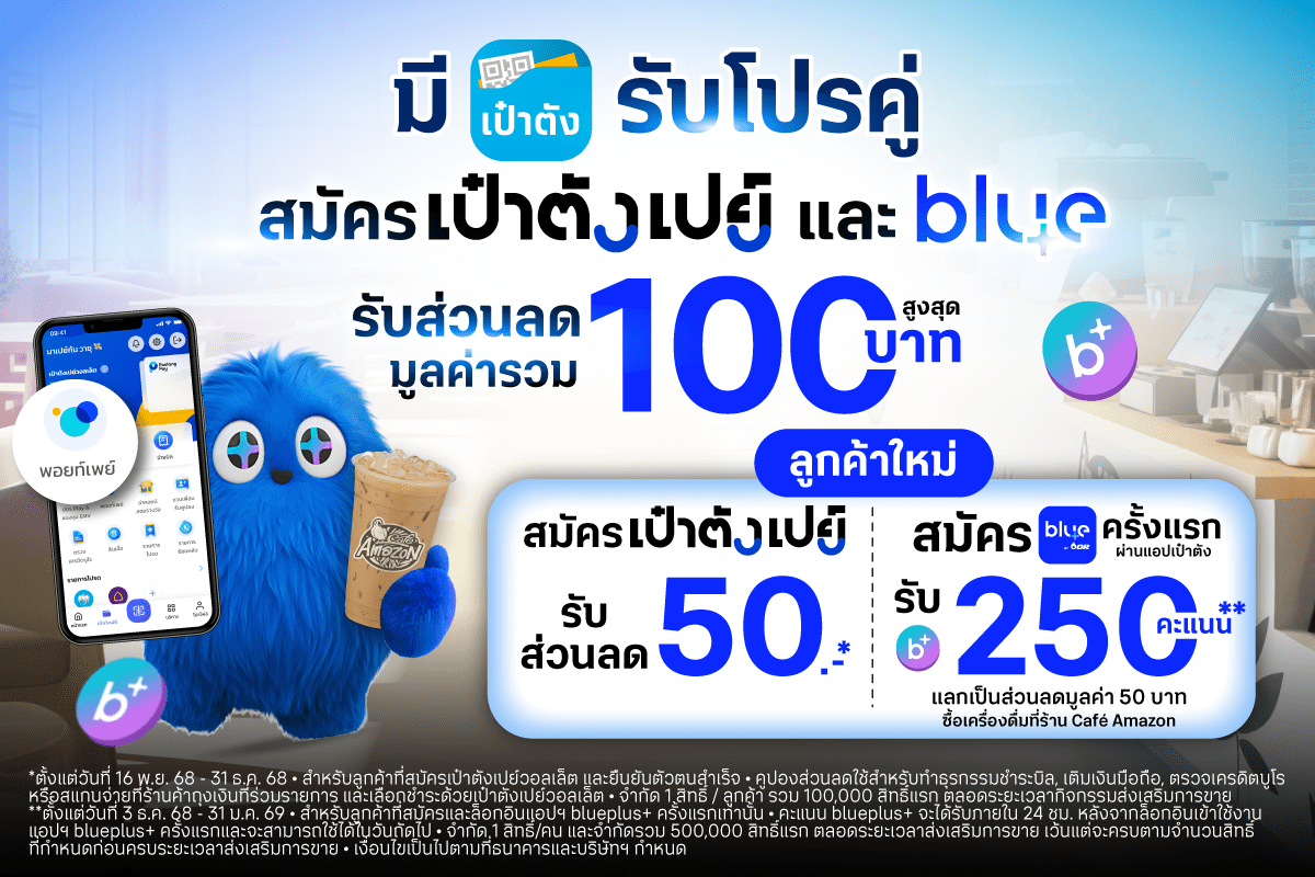 • ต่อที่ 1 รับ bluepoint 250 คะแนน เมื่อสมัครสมาชิก blueplus+ ผ่านแอปฯ เป๋าตัง และล็อกอินที่แอปฯ blueplus+ ครั้งแรก** โดยตั้งแต่วันที่ 3 ธันวาคม 2568 – 31 มกราคม 2569 ลูกค้าที่สมัครสมาชิก blueplus+ ผ่านแอปฯ เป๋าตัง และล็อกอินแอปฯ blueplus+ ครั้งแรกเท่านั้น จะได้รับคะแนน bluepoint 250 คะแนน (เทียบเท่ามูลค่า 50 บาท สำหรับแลกเครื่องดื่มมูลค่า 50 บาท ได้ฟรี 1 แก้ว ที่ร้าน Café Amazon ทุกสาขา ตลอดระยะเวลากิจกรรมส่งเสริมการขาย)