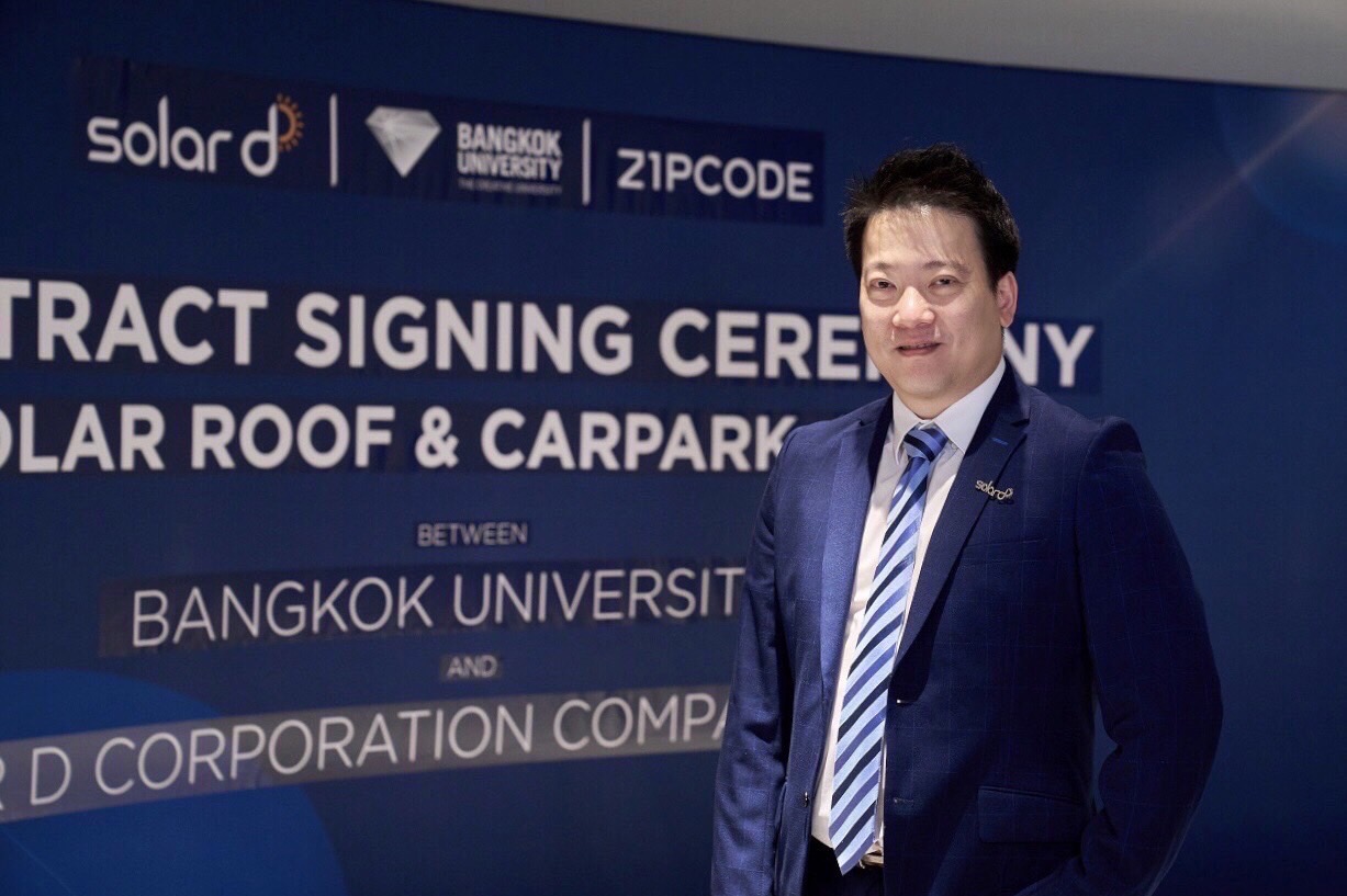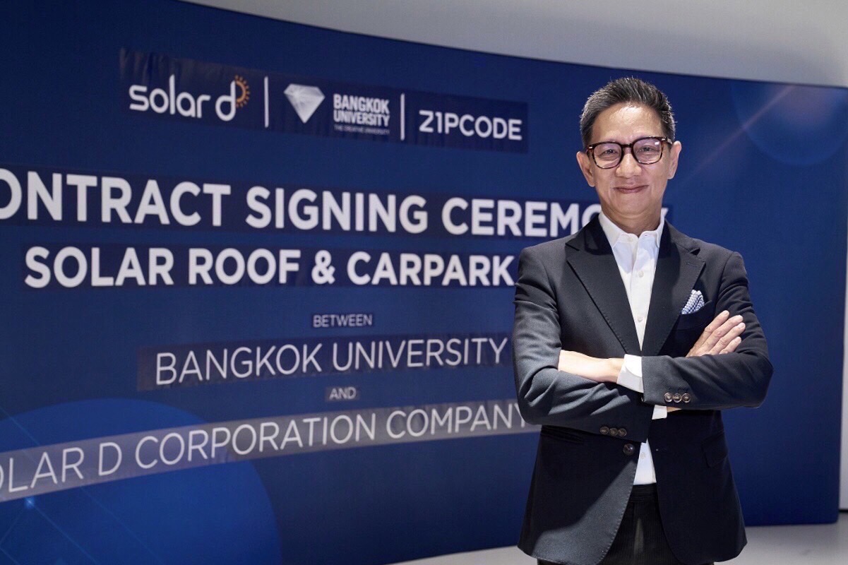 โซลาร์ ดี คอร์ปอร์เรชัน (Solar D) ผู้นำด้านพลังงานแสงอาทิตย์ นวัตกรรมระบบจัดเก็บและจัดการพลังงานไฟฟ้าสุดล้ำหนึ่งเดียวในไทย ร่วมกับ มหาวิทยาลัยกรุงเทพ และ บริษัท ซิปโคด จำกัด ร่วมลงนามสัญญาการให้บริการติดตั้งระบบอุปกรณ์ผลิตไฟฟ้าจากพลังงานแสงอาทิตย์แบบติดตั้งบนหลังคา Solar Rooftop ภายในบริเวณพื้นที่มหาวิทยาลัยกรุงเทพ มูลค่ากว่า 100 ล้านบาท เพื่อลดภาระค่าใช้จ่ายไฟฟ้า รวมถึงส่งเสริมการใช้พลังงานอย่างมีประสิทธิภาพและปลอดภัย พร้อมมอบ Tesla Powerwall สนับสนุนการศึกษาด้านพลังงาน ต่อยอดสู่การพัฒนาและยกระดับชีวิตนักศึกษาให้ดียิ่งขึ้น ตลอดจนผลักดันให้เกิดการใช้พลังงานทดแทนที่เป็นมิตรต่อสิ่งแวดล้อมในพื้นที่อย่างยั่งยืน