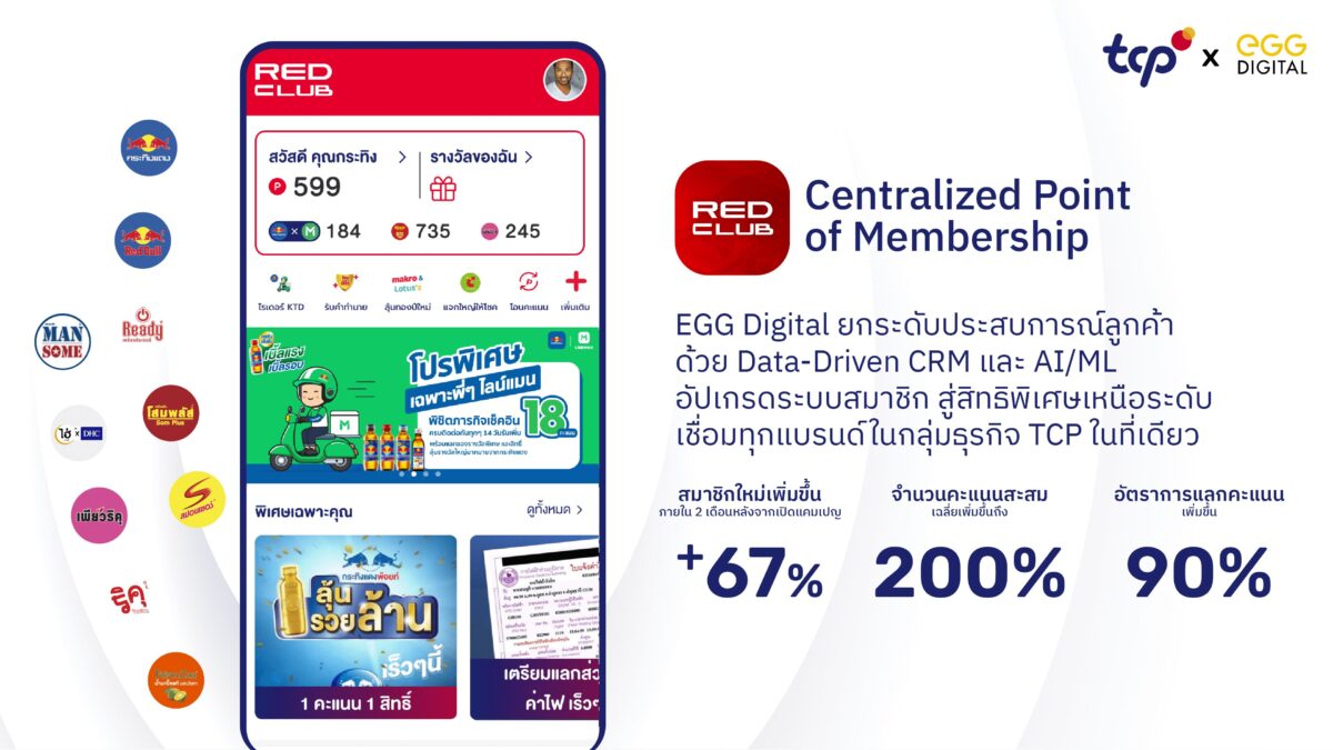 “กลุ่มธุรกิจ TCP” ผนึก “เอ้ก ดิจิทัล” พลิกโฉมระบบสมาชิก RedClub สู่มิติใหม่ ด้วยการออกแบบระบบ Loyalty Program ที่รวมทุกผลิตภัณฑ์ภายใต้กลุ่มธุรกิจ TCP ไว้ที่เดียว นำ AI/ML เข้ามาเสริมศักยภาพของระบบ อัปเกรดฟีเจอร์ ดาต้าแดชบอร์ด และโปรแกรมคำนวณ-สะสม-แลกคะแนน เพื่อยกระดับการสร้างประสบการณ์และมอบสิทธิพิเศษให้ลูกค้าสมาชิกแบบรายบุคคล พร้อมเชื่อมต่อทุกผลิตภัณฑ์ในเครือ นำเสนอกิจกรรมได้อย่างหลากหลายและตรงใจสมาชิกมากยิ่งขึ้น ครบจบในระบบเดียว พร้อมโชว์ระบบใหม่ช่วยเพิ่มจำนวนสมาชิกใหม่ได้ถึง 67% และเพิ่มยอดขายให้กับผลิตภัณฑ์ของกลุ่มธุรกิจ TCP